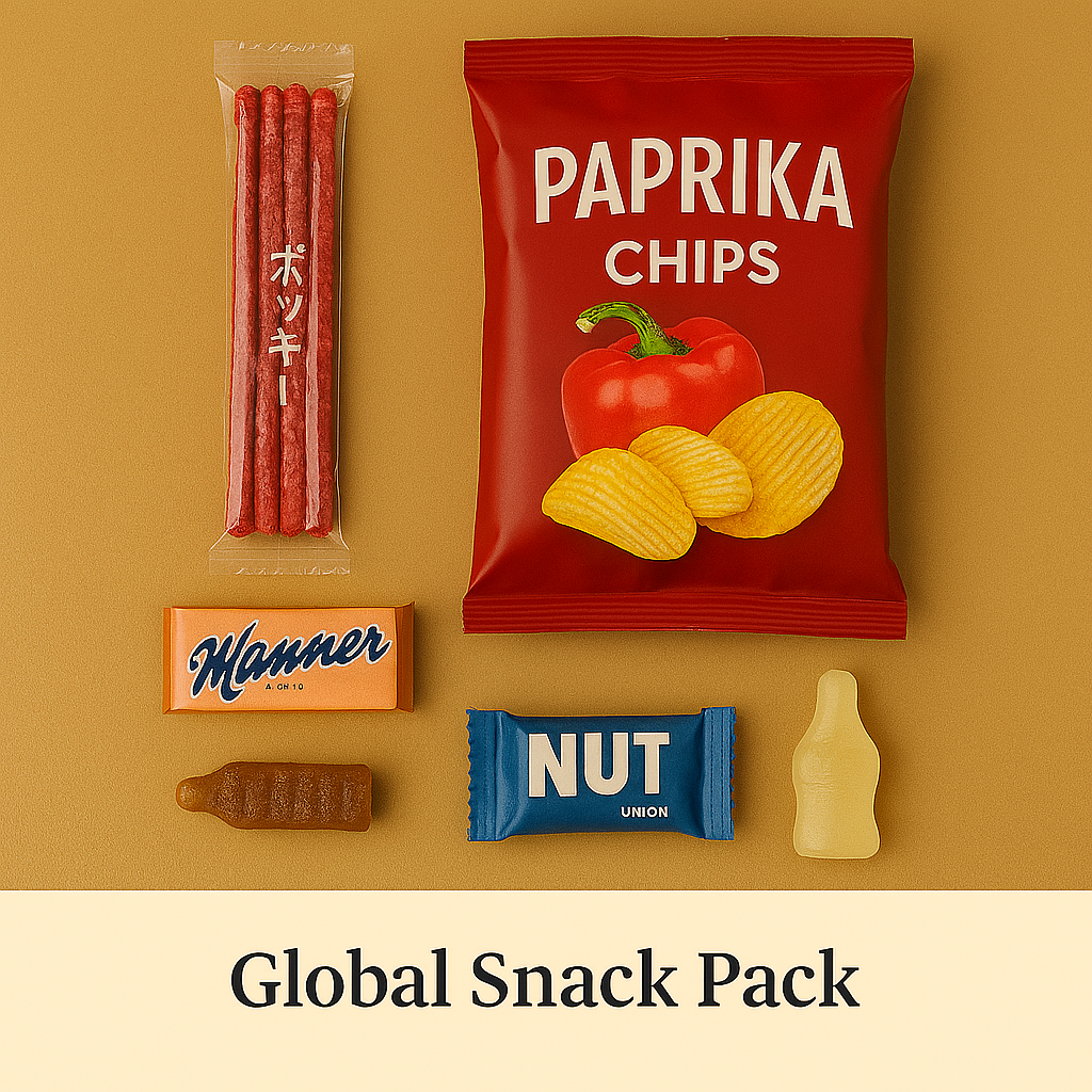 Take your taste buds on a world tour with the Global Snack Pack! This curated collection features a mix of iconic snacks from different corners of the globeโ€”crispy paprika chips, sweet chocolate wafers, chewy cola gummies, and more.